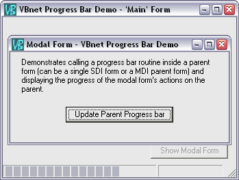 This is simple code that demonstrates how to use a normal VB progress bar on a parent form (SDI or MDI) to track the activity being performed in another form, even when that form is modal.