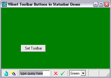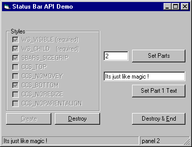 This code was prompted by a newsgroup request for code to place a VB command button inside a VB statusbar such that the button reacted normally to events yet was contained inside the status bar panel area. Attempts to use SetParent against the command button worked to re-parent the control, however