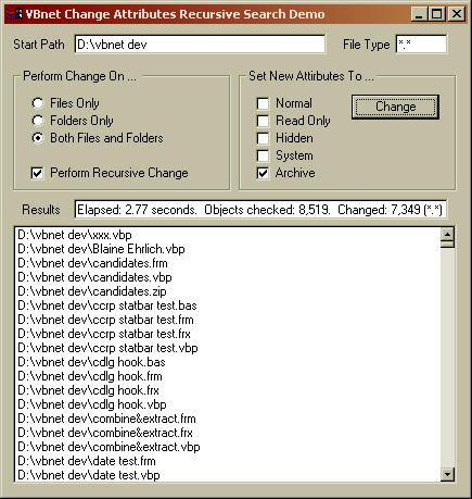 The basic recursion techniques from Performing Recursive Searches Using FindFirst and SearchTreeForFile are used in this demo, but modified to include code for changing either the file, folders or both beneath the target directory specified. The code returns to the list all files processed, as well