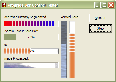 This control provides a highly flexible Progress Bar control with an array of drawing styles, including XP Style, segmented/non-segmented, bitmap bars and backgrounds and more. Alternatively, if you don't want the convenient packaging and design-time property settings provided by a control, you can