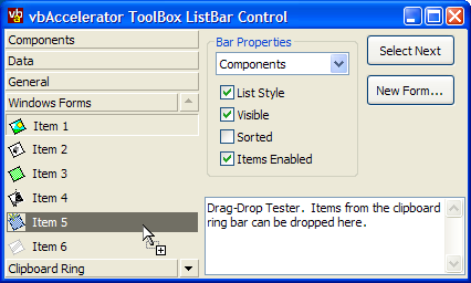 This control provides a full implementation of a Visual Studio-style List Bar which holds lists of controls. Bars and items can be dragged around the control, and items can be dragged, pressed or double-clicked to add the item to an object.