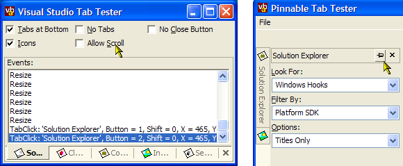 This control reimplements the tab drawing code used in the vbAccelerator MDITabs Control as a fully-featured Visual Studio style Tab Control, with a fully-typed object interface. It also supports pinning and unpinning tabs, so when they're unpinned they show a small vertical tab-bar which slides-out