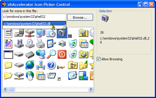 This control provides a simple to use icon selector, and works in the exactly the same way as the Change Icon dialog in Windows. You can either use it to select existing icons, or you can add your own.